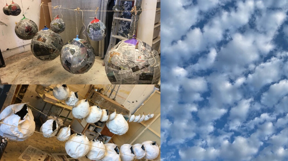 Alida’s installation element Lucht hangs in the clouds that are partly made of papier-mâché and paint and partly of glass-fiber reinforced polyester with light and sound.M