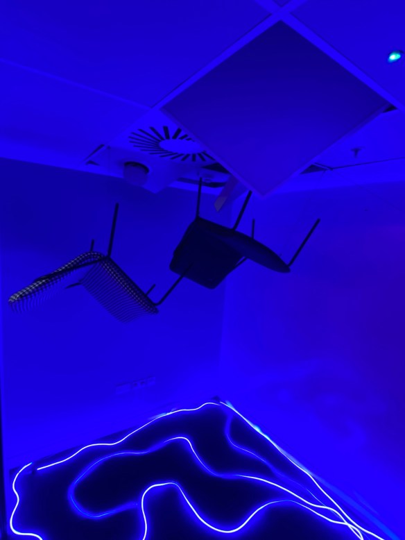 A room conjured from dream, between suspension and descent, space and time folded, twisted, at the still point of a shockwave stretching infinitely.